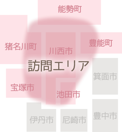 川西市を中心に、猪名川町、池田市、宝塚市、能勢町及び豊能町の一部地域まで在宅訪問を行っております。